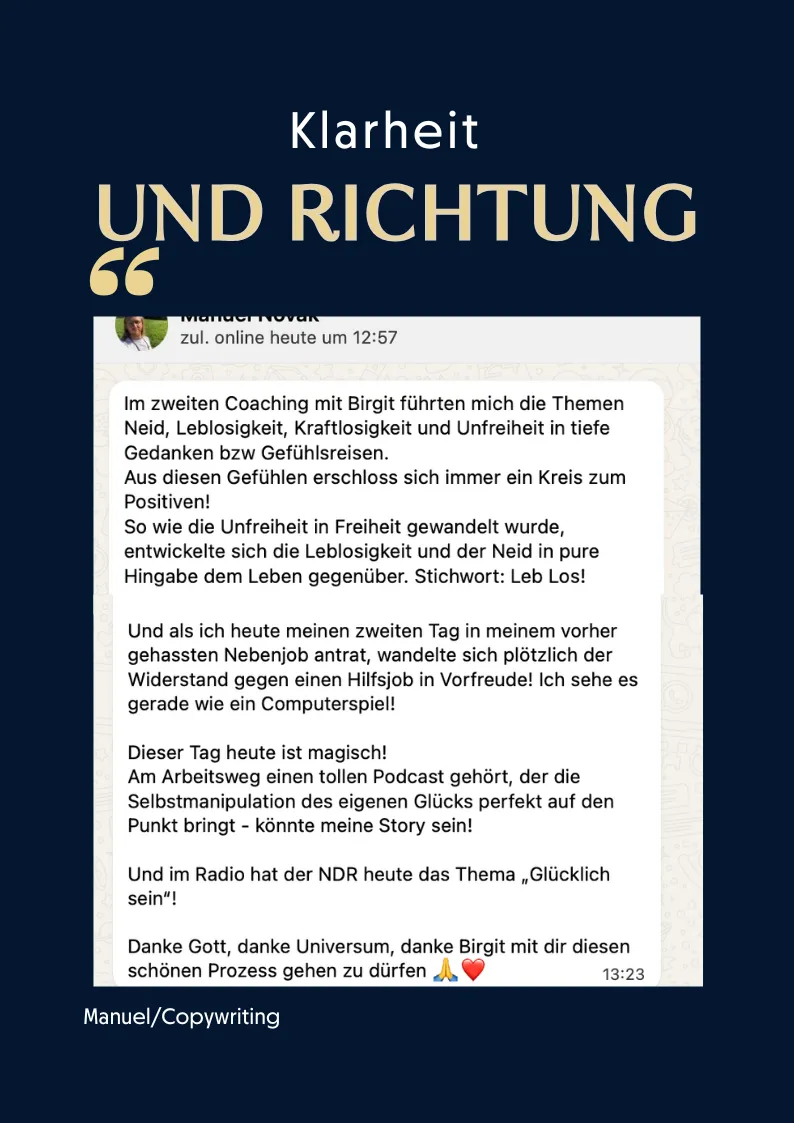 Und das Beste daran: Du wirst nicht allein gelassen. Mit täglichen Erinnerungen und gezielter Unterstützung gehen wir diesen Weg gemeinsam. Schritt für Schritt, in Deinem eigenen Tempo, hin zu mehr Klarheit, Erfolg und Freude – bis Du das Leben lebst, das Du Dir wirklich wünschst.